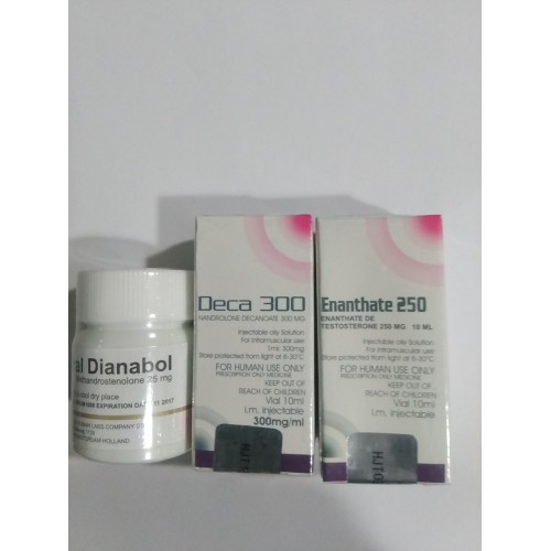 Este ciclo tiene como base fundamental la Testosterona Enantato de 250mg, la cual es un ester de testosterona, con una vida media de 10 días, por lo cual se recomienda inyectarse sólo 1 ml en una aplicación semanal equivalente a 250 mg de testosterona: Se agrega al ciclo el Decadurabolin-300 en una dosis de 300 mg por semana durante las 10 semanas del ciclo, equivalentes a 1 ml. El dianabol oral de 25 mg, se tomará a razón de 3 tabletas diarias, una cada 8 hrs, dado que el tiempo de vida media de este esteroide es de 6-8 hrs, esto permitirá mantener una dosis más estable en el organismo y preferentemente con los alimentos. La Testosterona y el Decadurabolin pueden aplicarse conjuntamente, para no tener que duplicar la inyección, sólo tome un mililitro de cada sustancia en la misma jeringa de 3 ml por ejemplo e inyecteselo. Ambas sustancias están preparadas en una base de aceite grado farmacéutico, siendo el vehículo en que ingresara a tu organismo, aplicándose vía intramuscular. Este ciclo le permitirá ganar unos 6-8 kg de masa muscular con una dieta apropiada.