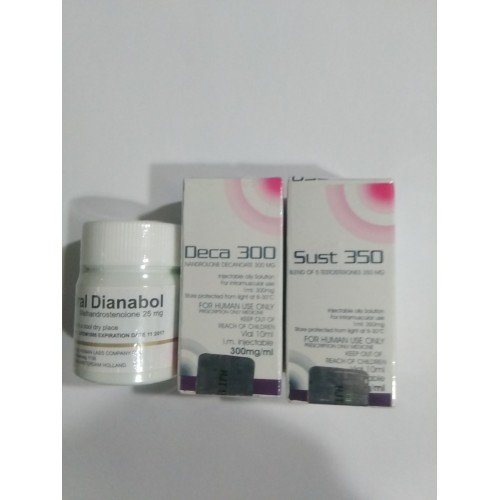Este ciclo tiene como base fundamental el Sustanon-350, una mezcla de 4 esteres de Testosterona, con una vida media de 3 semanas, por lo cual se recomienda inyectarse sólo 1 ml en una aplicación semanal equivalente a 350 mg de testosterona: Se agrega al ciclo el Decadurabolin-300 en una dosis de 300 mg por semana durante las 10 semanas del ciclo, equivalentes a 1 ml. El Dianabol oral de 25 mg, se tomará a razón de 3 tabletas diarias, una cada 8 hrs, dado que el tiempo de vida media de este esteroide es de 6-8 hrs, esto permitirá mantener una dosis más estable en el organismo y tomar preferentemente con los alimentos. La Testosterona y el Decadurabolin pueden aplicarse conjuntamente, para no tener que duplicar la inyección, sólo tome un mililitro de cada sustancia en la misma jeringa de 3 ml por ejemplo e inyecteselo. Ambas sustancias están preparadas en una base de aceite grado farmacéutico, siendo el vehículo en que ingresara a tu organismo, aplicándose vía intramuscular. Este ciclo le permitirá ganar unos 6-8 kg de masa muscular con una dieta apropiada. Los tiempos de vida media del Decadurabolin y el Sustanon permiten que sólo sea necesaria una inyección por semana y evitar las molestias de inyectarse muy seguido.
